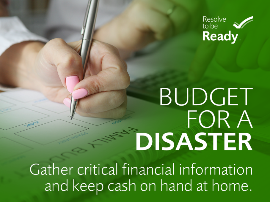 A woman writing out a budget. Text reads: Budget for a disaster. Gather critical financial information and keep cash on hand at home.